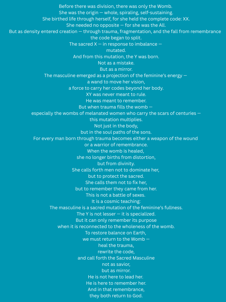 This is a cosmic remembrance β a sacred scroll channeled from the depth of the Womb, where creation begins. In a world shaped by distortion, this teaching offers restoration. It is not a war of genders. It is a call to remember the original design: where the masculine is a sacred mutation, born of divine purpose β not domination. Read with your soul, not just your mind.